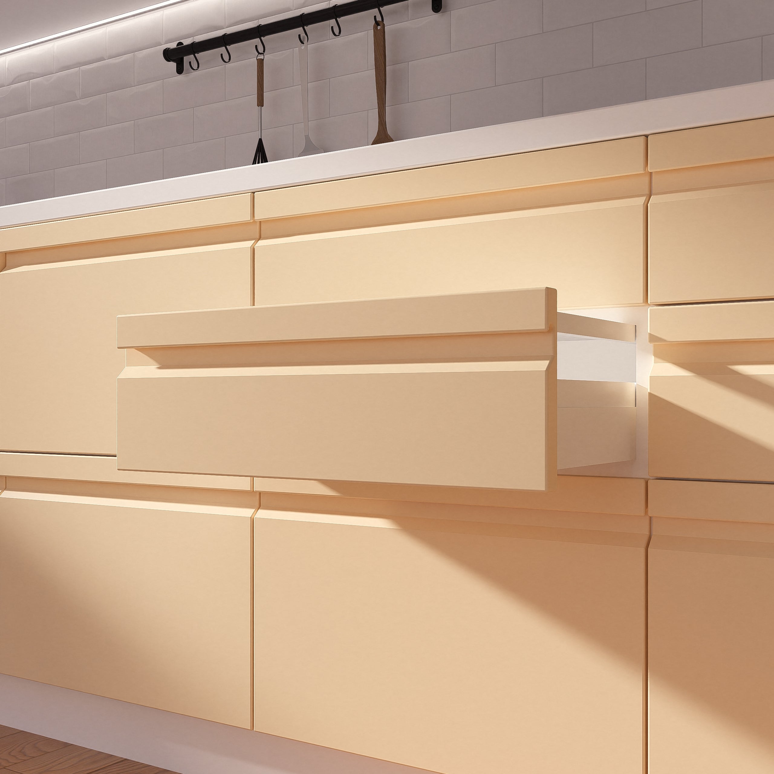 Inspirate din armonia și simplitatea stilului japandi, ușile Tranquil îți transformă bucătăria într-o casă scandinavă echilibrată. Culorile și texturile naturale merg excelent cu decoruri rustice sau contemporane. Și pentru că are mânerul încorporat, am ales să o facem în grosime de 22 mm.